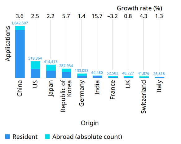 Figure 2: Patent applications for the top 10 origins, 2023 [3]
